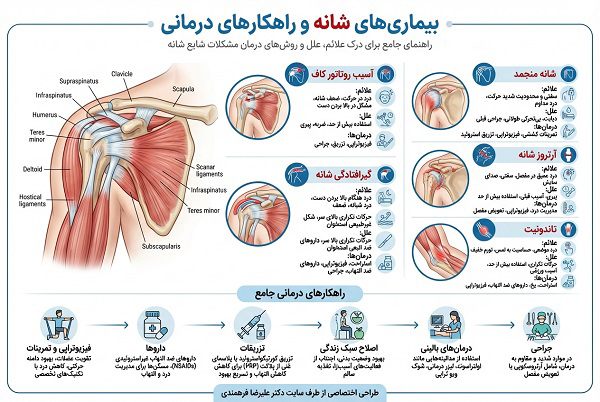 | شانه منجمد (فروزن شولدر) | بی حرکتی طولانی، دیابت | خشکی شدید، محدودیت حرکت |